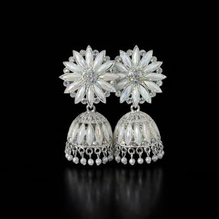 Make a graceful statement with these stunning silver-tone floral jhumka earrings, adorned with shimmering stones and delicate pearl drops. Perfect for weddings and festive wear, these designer ethnic earrings elevate any look.