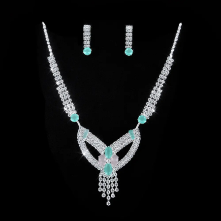 Elevate your elegance with this dazzling silver-tone necklace set featuring aqua green stones and sparkling crystal detailing. Perfect for weddings, parties, and festive occasions, this designer jewelry set adds a graceful charm.