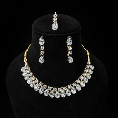 Enhance your festive look with this elegant crystal necklace and earrings set, featuring sparkling teardrop stones and a premium gold-tone finish. Ideal for weddings and parties, this women’s jewelry set offers timeless beauty, lightweight comfort, and luxurious ethnic charm.