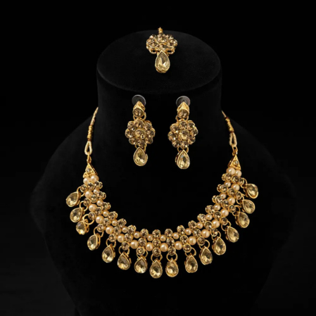Make a grand statement with this elegant artificial necklace set featuring intricate gold detailing and matching earrings. Crafted from premium artificial jewellery materials, this lightweight artificial necklace set is perfect for weddings, festive occasions, and party wear, adding royal charm to your look.